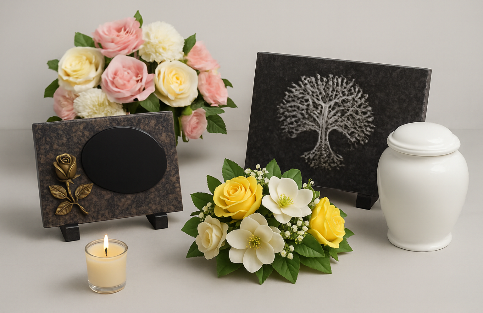 En plus de nos plaques funéraires et de nos fleurs artificielles, Pompes Funèbres Potier Vandamme et Fils vous proposent en magasin de nombreux articles funéraires supplémentaires pour rendre hommage à vos proches de manière personnelle.